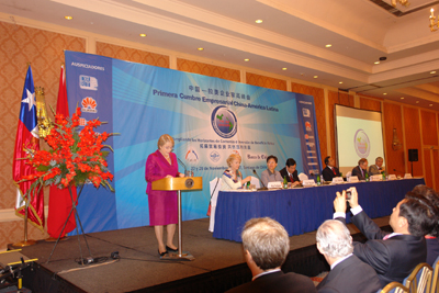 《今日經(jīng)濟(jì)》、《今日管理》代表與全國政協(xié)副主席李蒙(前排右四)合影 | 智利女總統(tǒng)米歇爾•巴切萊特在會(huì)上演講,熱烈歡迎中國企業(yè)家代表團(tuán)來訪并祝訪問成功 |